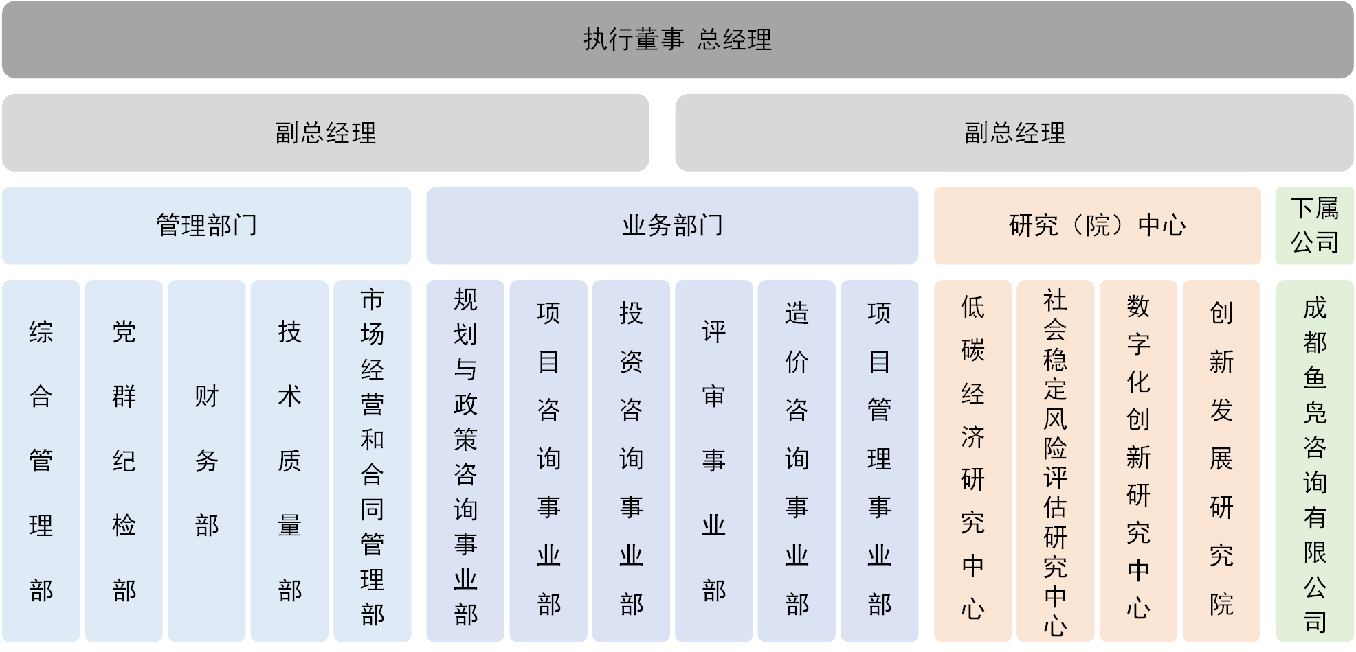 公司本科及以上學(xué)歷員工占比93%,碩士及以上學(xué)歷員工占比47%;正高級(jí)工程師7人,高級(jí)工程師28人,擁有全國咨詢工程師(投資)、全國注冊(cè)造價(jià)工程師以及注冊(cè)城鄉(xiāng)規(guī)劃師等各類專業(yè)技術(shù)資格人才占比超過65%。公司下設(shè)11個(gè)部門,4個(gè)研究(院)中心。其中,業(yè)務(wù)部門6個(gè),包括規(guī)劃與政策咨詢事業(yè)部、項(xiàng)目咨詢事業(yè)部、投資咨詢事業(yè)部、評(píng)審事業(yè)部、造價(jià)咨詢事業(yè)部和項(xiàng)目管理事業(yè)部;4個(gè)研究(院)中心分別為低碳經(jīng)濟(jì)研究中心、社會(huì)穩(wěn)定風(fēng)險(xiǎn)評(píng)估研究中心、數(shù)字化創(chuàng)新研究中心和創(chuàng)新發(fā)展研究院。為推動(dòng)行業(yè)數(shù)字化、智能化轉(zhuǎn)型發(fā)展,公司還與西南交通大學(xué)經(jīng)濟(jì)管理學(xué)院共建工程咨詢智能決策研究中心和產(chǎn)學(xué)研合作示范研究基地。公司現(xiàn)有控股子公司1家,為公司與溫江區(qū)屬國有公司合資成立的成都魚鳧咨詢有限公司。